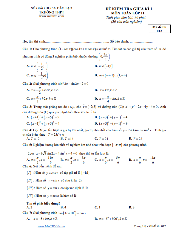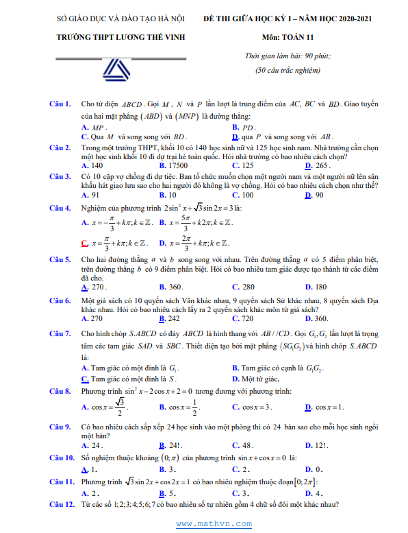Đề thi giữa học kì 1 môn Toán lớp 11 có đáp án (50 câu trắc nghiệm)