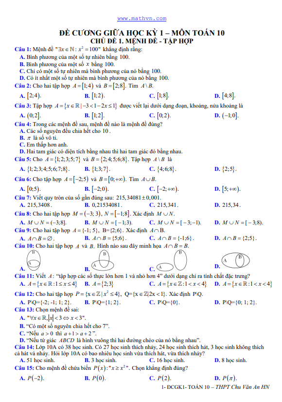 Đề cương ôn tập giữa học kì 1 Toán lớp 10 (trắc nghiệm)
