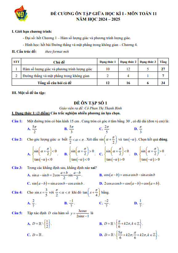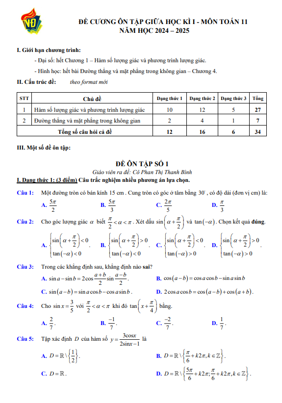 Đề kiểm tra giữa kỳ 1 Toán 11 theo dạng đề tốt nghiệp 2025 (3 phần)