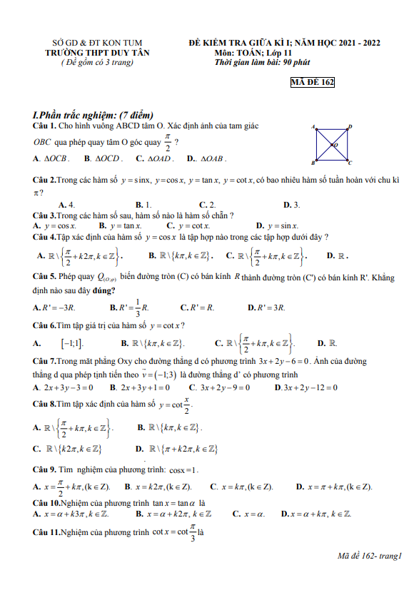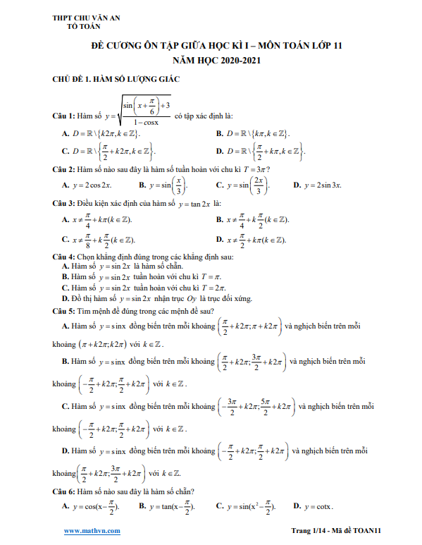 Đề cương giữa kì 1 môn Toán lớp 11 (trắc nghiệm + tự luận)