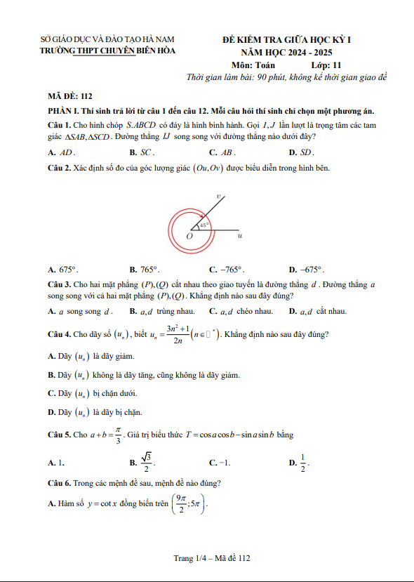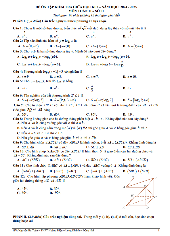 Đề kiểm tra giữa kỳ 1 Toán 11 theo dạng đề tốt nghiệp 2025 (3 phần)